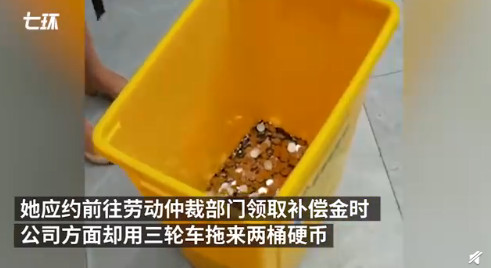 9月14日,张女士在四川资中一家医学美容公司离职后,通过劳动仲裁获得6000多元补偿金。当天她到劳动仲裁部门领取补偿金,公司却用三轮车拉来两桶硬币给她。张女士认为公司此举涉嫌侮辱,“不存在他们所说的业绩不行。”涉事公司李经理称,并未故意刁难,所有钱币都可以使用,“公司已经一分不少的支付了,不要是她自己事。”