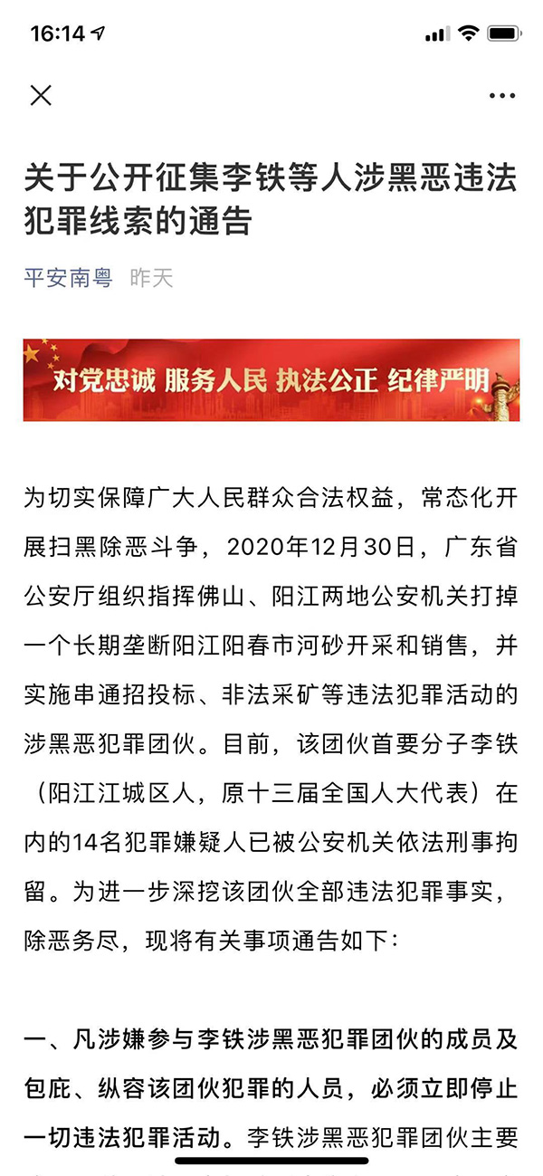 2月3日,广东省公安厅官方微信公众号“平安南粤”发布《关于公开征集李铁等人涉黑恶违法犯罪线索的通告》(以下简称“《通告》”)称,2020年12月30日,广东省公安厅组织指挥佛山、阳江两地公安机关打掉一个长期垄断阳江阳春市河砂开采和销售,并实施串通招投标、非法采矿等违法犯罪活动的涉黑恶犯罪团伙。目前,该团伙首要分子李铁(阳江江城区人,原十三届全国人大代表)在内的14名犯罪嫌疑人已被公安机关依法刑事拘留。