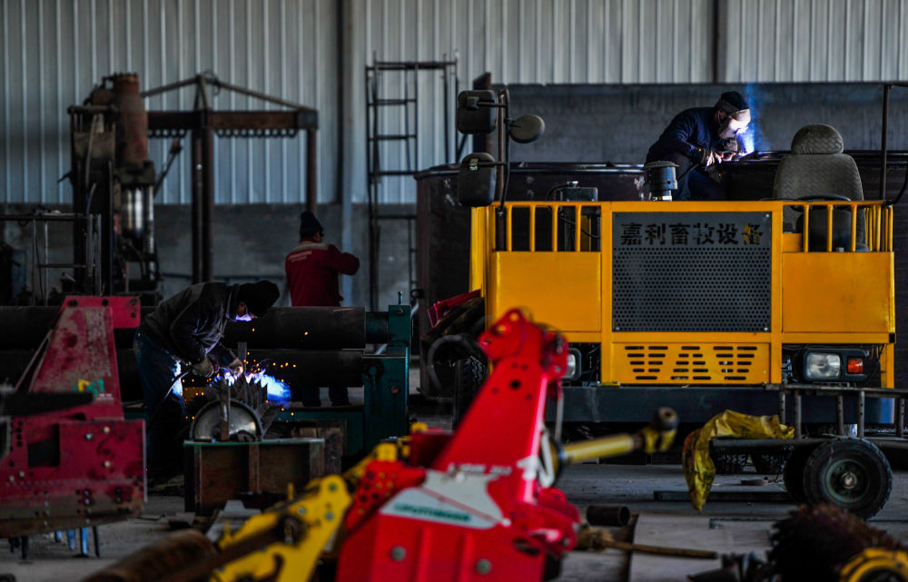 ↑2020年3月10日,工人在内蒙古嘉利节水灌溉有限公司厂房内加工零件。