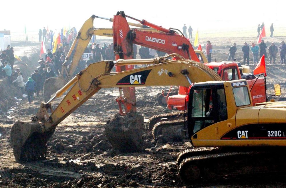 ↑2002年12月27日在江苏扬州宝应县南水北调东线工程潼河工地拍摄的施工现场。南水北调工程在这一天正式开工建设。