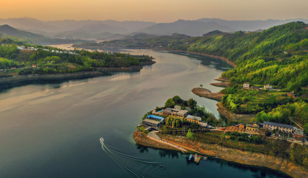↑陕西安康市流水镇位于南水北调中线重要水源——汉江中游。近年来,当地因地制宜大力推广有机农产品的种植,发展乡村旅游等低污染产业。这是流水镇景色(3月27日摄)。