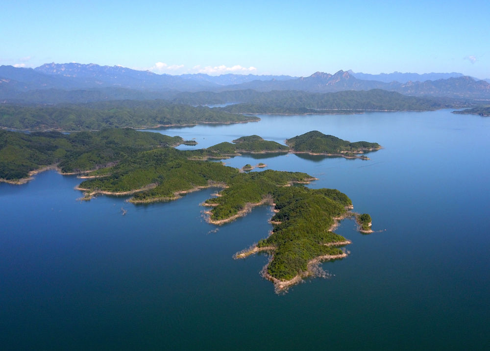 ↑南水北调,让北京“大水缸”——密云水库蓄水量大增,水质长期保持国家地表水环境质量Ⅱ类标准。这是密云水库风光(无人机照片,2020年9月1日摄)。