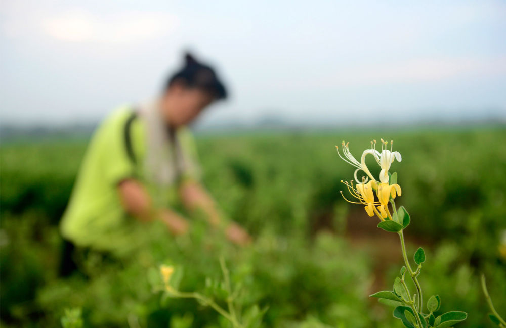 ↑农民在河南省淅川县九重镇中药材种植基地采摘金银花(2016年7月30日摄)。位于南水北调中线一期工程水源地的淅川县,通过发展金银花、软籽石榴、有机蔬菜等绿色生态产业,实现了生态保护和百姓增收的平衡发展。