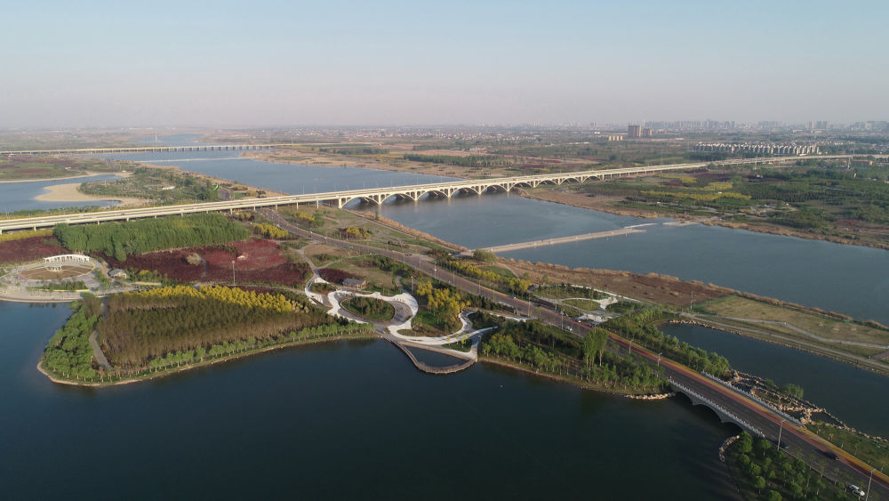 ↑南水北调生态补水,让干涸了几十年的石家庄母亲河——滹沱河重现生机(无人机照片,2021年4月13日摄)。