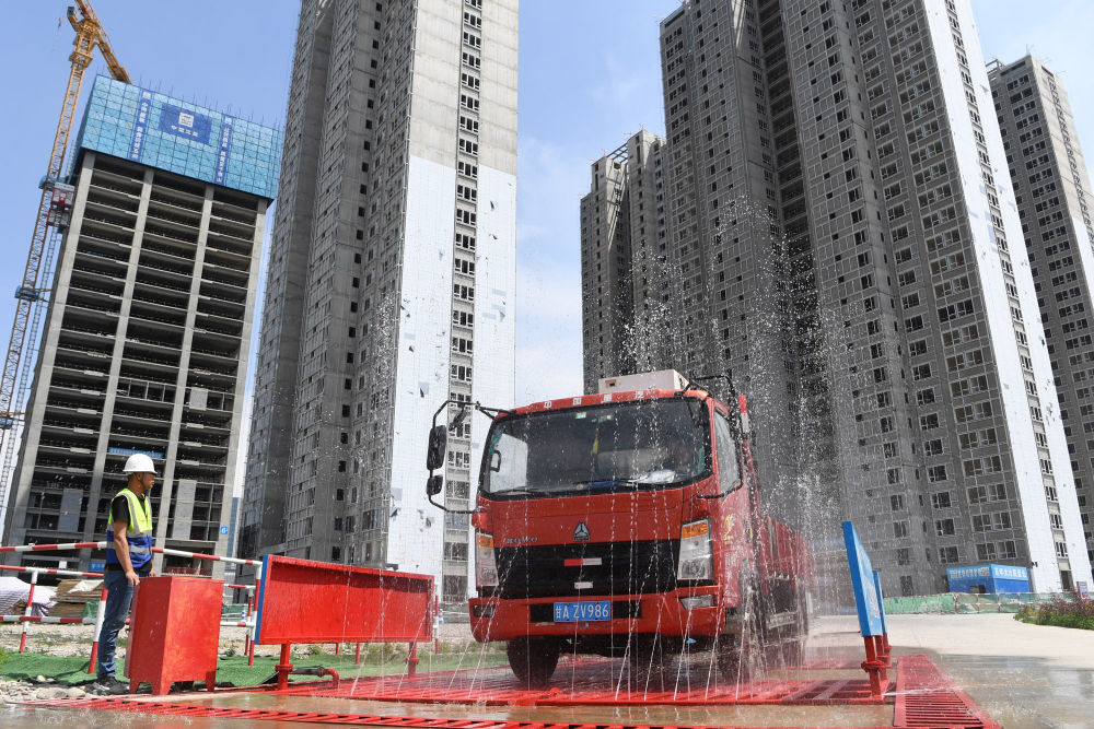 ↑在甘肃省兰州市中建三局一处建设工地上,感应式的洗车台利用循环再生水冲洗车辆,并对污水再次回收利用(5月12日摄)。