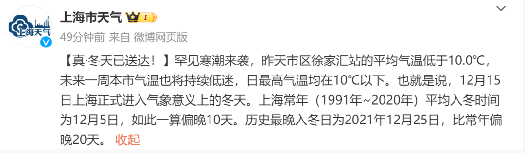雨夹雪基本就是曾经来过 绝大部分朋友都没有见到 .... 官宣:上海12月15日已入冬 继早晨“不认真的雨夹雪”之后 阳光短暂归位 湿搭搭的感觉收敛 但寒冷的暴击“非常认真” 加上北风阵阵 气温没有一点起色 今天白天徐家汇站最高只有2.3℃ 这轮寒潮“冻”真格 也使昨天市区徐家汇站的 平均气温低于了10.0℃ 让申城直接实现“入冬” 即12月15日上海正式进入气象意义上的冬天。上海常年(1991年~2020年)平均入冬时间为12月5日,如此一算偏晚10天。历史最晚入冬日为2021年12月25日,比常年偏晚20天。 上海发布低温黄色预警 “两蓝一黄”预警高挂 今年下半年首个低温黄色预警信号 上海中心气象台2023年12月16日15时30分发布低温黄色预警信号:受强冷空气影响,预计今天夜里到明天早晨本市大部地区最低温度将下降到零下3℃以下,请注意防寒保暖。 目前,寒潮蓝色预警和大风蓝色预警依然高挂。 防御指南: 1、市民需增添衣物,注意保暖。 2、对农作物采取防冻措施。 3、户外露天作业采取防冻、防滑措施。 4、政府及相关部门按照预案,做好低温应对工作。 截至目前,上海 大风蓝色、寒潮蓝色预警 正在生效中 防御指南: 1、市民需增添衣物,注意保暖。 2、对农作物采取防冻措施。 3、户外露天作业采取防冻、防滑措施。 4、政府及相关部门按照预案,做好低温应对工作。 防御指南: 1、检查门窗,加固晾衣架,室外天线等,妥善安置室外花盆等易落物品。 2、外出时尽量不要在玻璃门窗、广告牌附近逗留。 防御指南: 1、外出时注意防风保暖,增添衣物。 2、老人、小孩尽量减少外出,在家关好门窗。 3、加强农用大棚、棚舍的保暖措施。 明日天气市区下半年首次跌破冰点 明天晴归晴,但冷,还在升级!最低气温0℃线可南压至贵州南部和江南北部一带,申城明天将迎来本次寒潮过程的气温最低点。市区最低温度可达零下3度,有冰冻,郊区零下4度到零下6度,有冰冻或严重冰冻。白天最高气温止步3度左右,完全就是一个天然冰箱。好在风力有所减小,转西北风4-5级,沿江沿海地区阵风6级。出行注意防滑和交通安全,时刻注意做好保暖。恰逢周末,宅家取暖或许更合适。 天气趋势什么时候回温?新的一周还有新的冷空气 下周初暖湿气团反击,气温止跌反弹,市区最低气温回到零度以上,最高气温在6~7℃,但下着小雨,湿冷将会出没。 而下周冷空气还在一次次“助攻”,由于基础气温已经比较低,更会冷上加冷。下周四早晨中心城区最低气温又会降至零下3℃,郊区更低,白天最高气温仅有2℃。下周末气温“小碎步”回升,但毕竟也都不足10℃,寒冷持续时间较长,防寒保暖依然是重中之重。 来源:东方网综合上海发布、上海市天气等