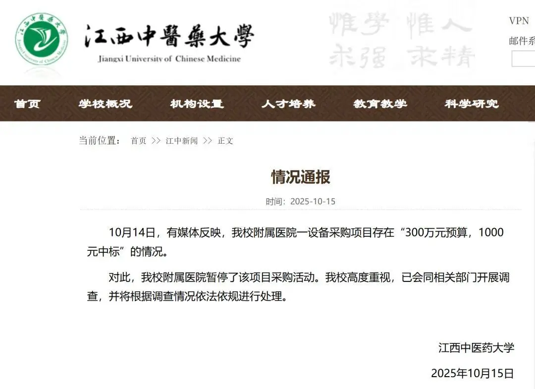 校附院设备采购“300万元预算,1000元中标”,江西中医药大学通报