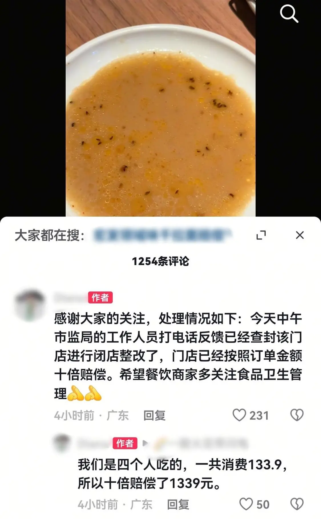 10月14日,该网友在视频评论区留言称,当天中午市场监管部门工作人员联系其反馈称,已经查封该门店进行闭店整改,门店按照订单金额十倍赔偿。自己一行四人共消费133.9元,门店赔偿了1339元。