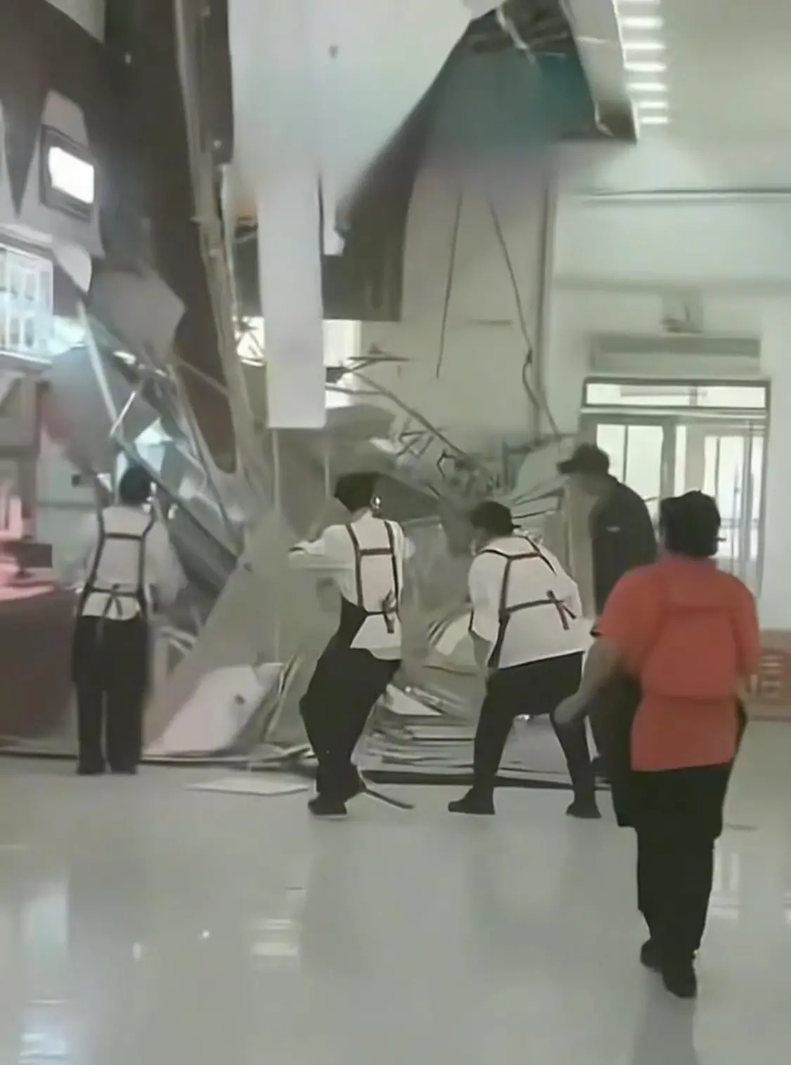 据网友发布的现场视频和图片显示,在食堂窗口旁,一片吊顶突然垮落到地上,附近有人疑似觉察到异样迅速躲开,随后有穿着厨师服的人员过来处理。