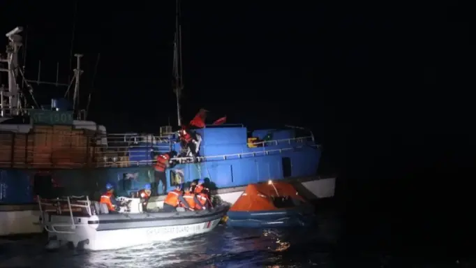 据中国海警此前消息,5月13日,中国海警局直属第二局成功救助8名外籍遇险渔民。当日17时31分,中国海警局直属第二局接上级通报,1艘韩国籍渔船“887EOJIN”在东海海域遇险,船体破裂、情况危急。该局指派三门舰和梅山舰全速赶往事发海域,同步启动应急预案、对接浙江海洋搜救中心,协调附近船只联合救助。