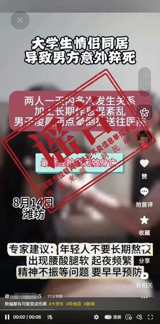 近日,网络上出现一则关于“潍坊大学生情侣同居导致男方意外猝死”事件信息。经核实,事发地非潍坊。网络上流传事发地为潍坊的说法是谣言。