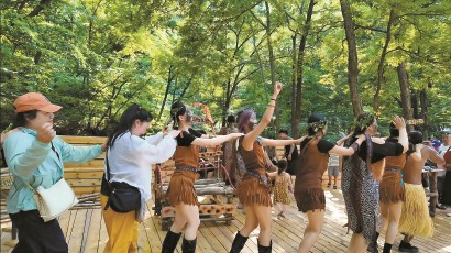 在辽宁本溪关山湖景区“野人谷”,“野人”NPC与游客们跳舞互动。徐朗益 摄