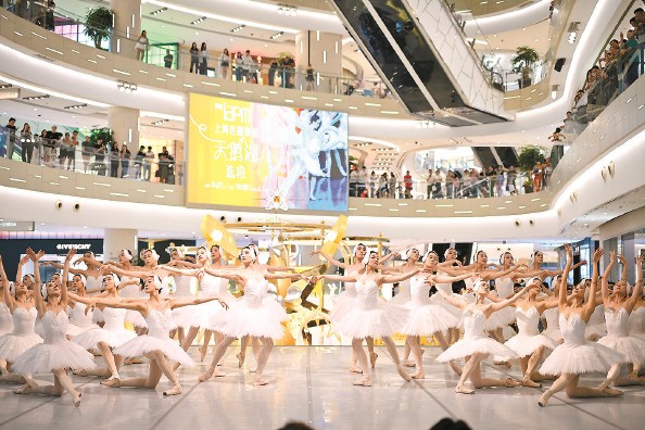 昨天,浦东环贸iapm商场中庭变身舞台,上海芭蕾舞团演员为周末前来休闲购物的市民献上经典版《天鹅湖》特别演出。这是商场为国庆中秋双节推出的系列活动之一本报记者 刘歆 摄