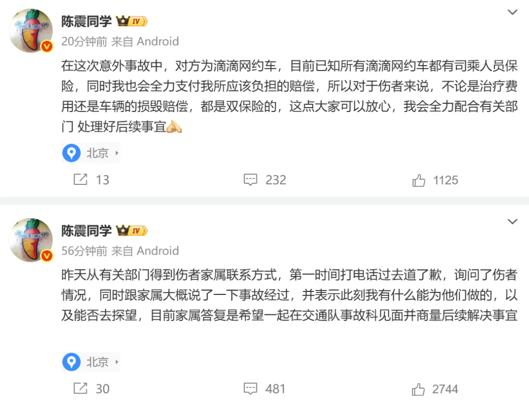 此前,陈震于10月3日驾驶一辆劳斯莱斯闪灵在北京万寿路发生了交通事故,引发业界广泛关注。10月5日,北京交警通报事故情况称,经初步调查,陈震负事故全部责任,目前事故正在进一步处理中。其后,陈震转发称,“一切以官方通告,车辆EDR数据为准。”