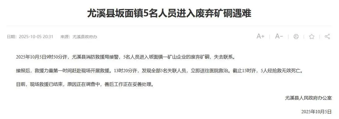 极目新闻记者 肖名远 10月5日晚,福建省三明市尤溪县政府办公室发布通报:“10月5日9时50分许,尤溪县消防救援局接警,5名人员进入坂面镇一矿山企业的废弃矿硐,失去联系。救援力量第一时间赶赴现场开展救援。13时20分许,发现全部5名失联人员,立即送往医院救治。截至15时许,5人经抢救无效死亡。目前,现场救援已结束,原因正在调查中,善后工作正在妥善处理。”