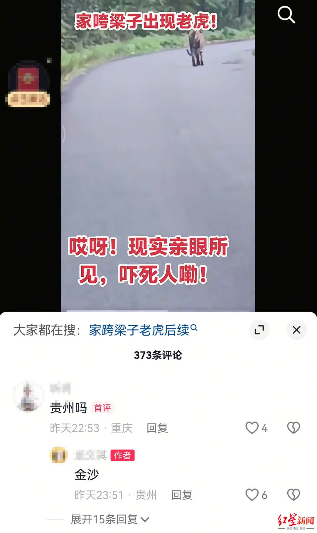 10月7日晚,贵州一网友在短视频平台发布视频,称“家咵梁子出现老虎”“现实亲眼所见,吓死人嘞”,在回复其他网友时还称在金沙。