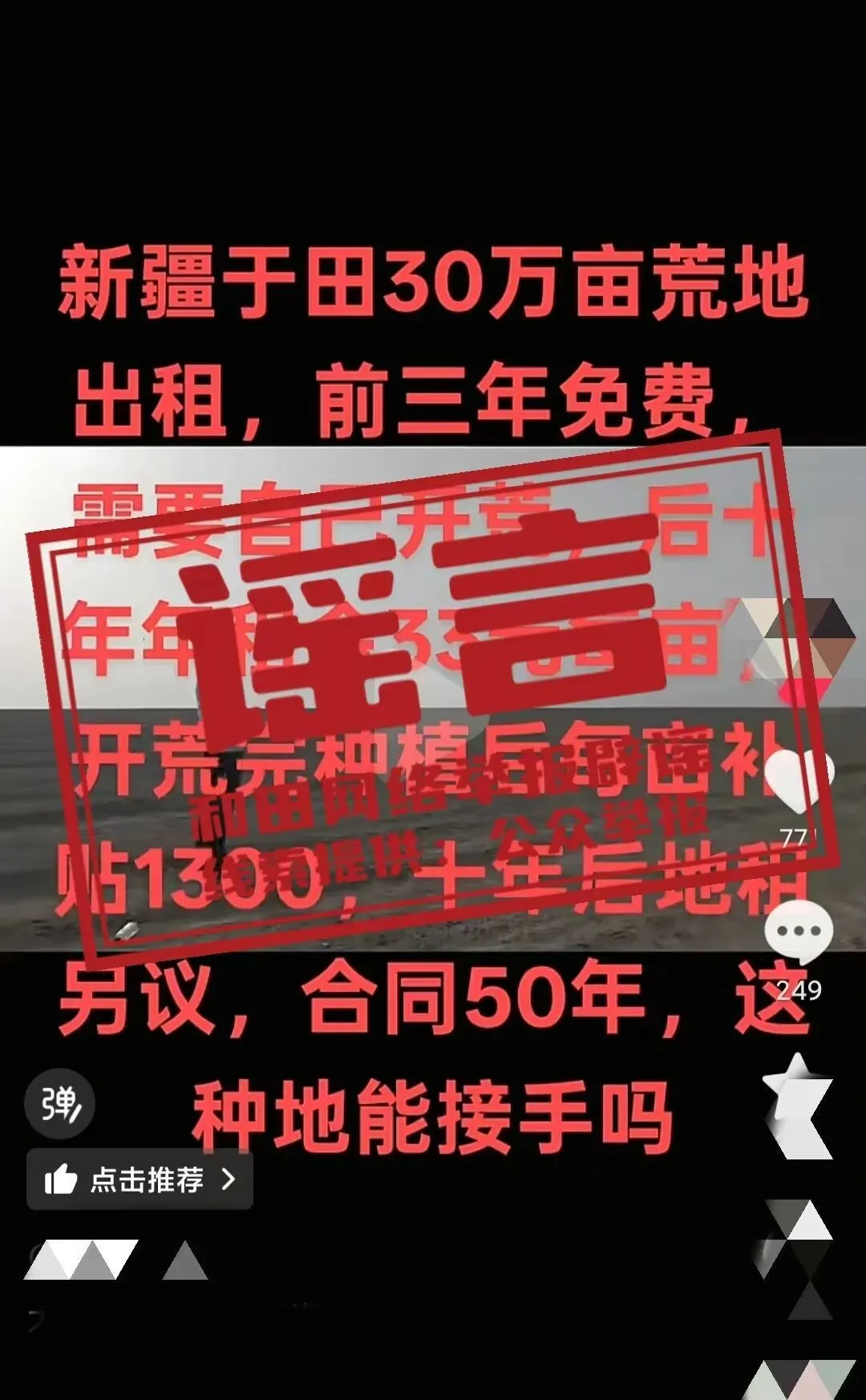 新疆于田30万亩荒地出租,前3年免费?官方辟谣