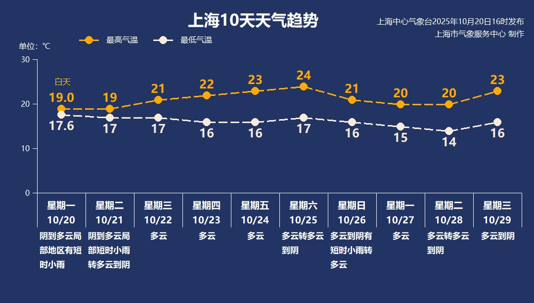 周二天气和周一类似,气温在17~19℃,风力依旧较大,大风天气会持续到周三前后。周三至周六,申城基本是多云为主的天气,白天气温逐渐回升,秋高气爽,昼夜温差较大,白天舒适,早晚凉,大家要注意及时调整着装,谨防感冒。