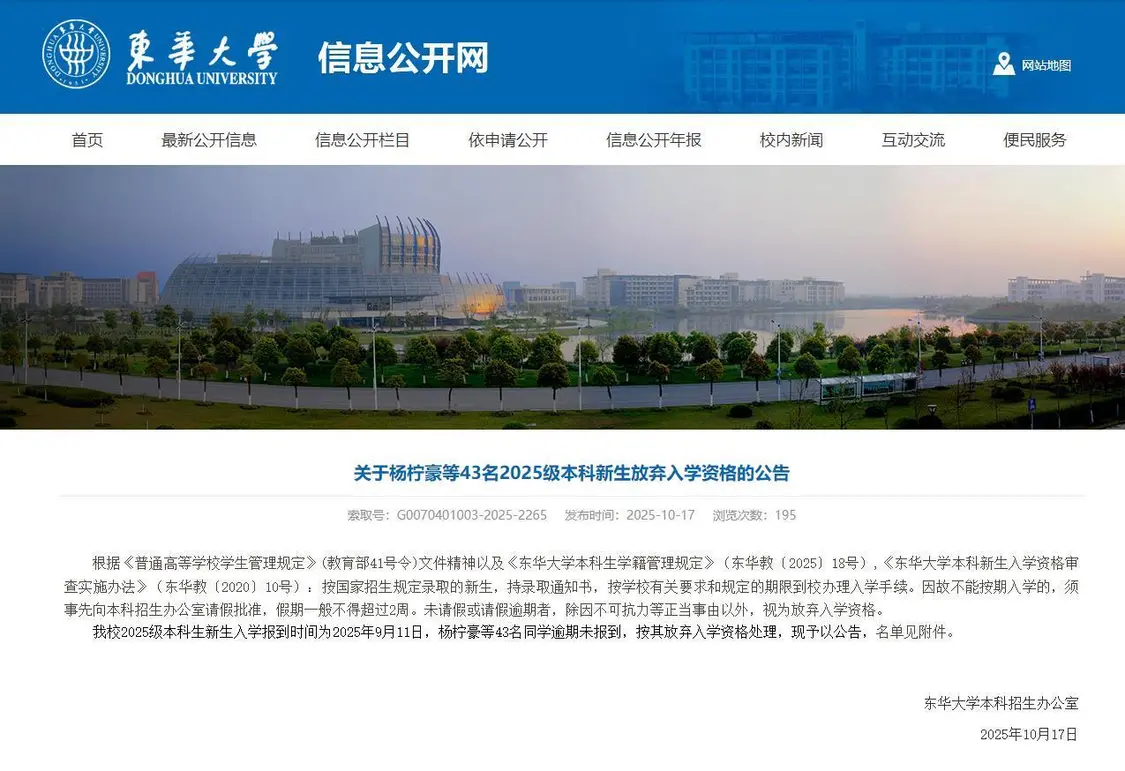 记者在该校官网上查询到,10月17日,该校发布关于43名2025级本科新生放弃入学资格的公告,公告称,根据《普通高等学校学生管理规定》(教育部41号令)文件精神以及《东华大学本科生学籍管理规定》(东华教〔2025〕18号),《东华大学本科新生入学资格审查实施办法》(东华教〔2020〕10号):按国家招生规定录取的新生,持录取通知书,按学校有关要求和规定的期限到校办理入学手续。因故不能按期入学的,须事先向本科招生办公室请假批准,假期一般不得超过2周。未请假或请假逾期者,除因不可抗力等正当事由以外,视为放弃入学资格。我校2025级本科生新生入学报到时间为2025年9月11日,有43名同学逾期未报到,按其放弃入学资格处理,现予以公告。