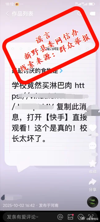 经新野县教体局、新野县市场监督管理局现场检查,学校食材供应有严格的检查程序和流程,不存在有淋巴肉流入学校食堂。学校报案后,经网信、公安调查确认,信息发布者为该校一在校学生,因对学校食堂不满和对法律的无知,编造虚假信息在快手平台发布。学校对该生进行了批评教育,学生深刻的认识到自己的错误,保证以后遵守互联网相关法律法规,不编造传播谣言。随后该生自行删除了网上发布的视频。