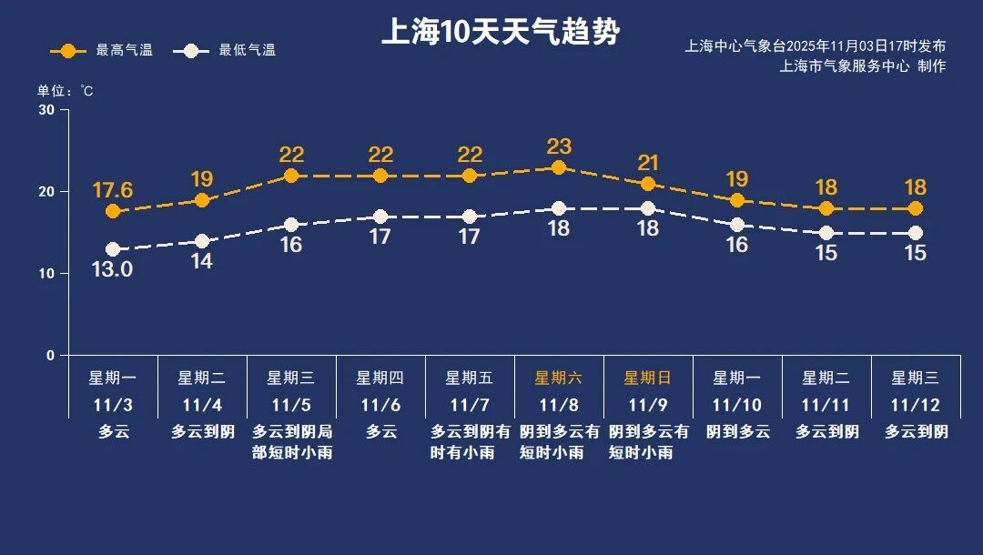 本周气温逐日回升,周后期最高气温重回23℃附近。雨水有所增多,本周三以及周五至周日,受短波槽东移影响,会出现短时小雨,降水较弱,无碍出行。下周初冷空气再临申城,气温下滑。