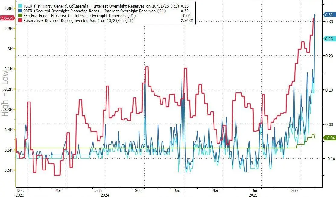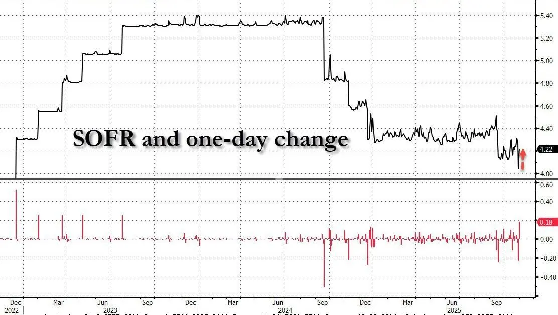 更糟的是:要了解上周五美国资金市场究竟有多紧,只需看看有担保隔夜融资利率(SOFR)可能就够了——10月31日该利率飙升18个基点至4.22%。按理说,考虑到上周美联储已再度降息,该利率理应维持在4.00%左右,但现实却是仿佛美联储从未降息过…… 18个基点的升幅是自2023年(即美联储上一次加息时)以来的最大单日涨幅。若不计加息周期,这是自2020年3月以来最大单日波动。