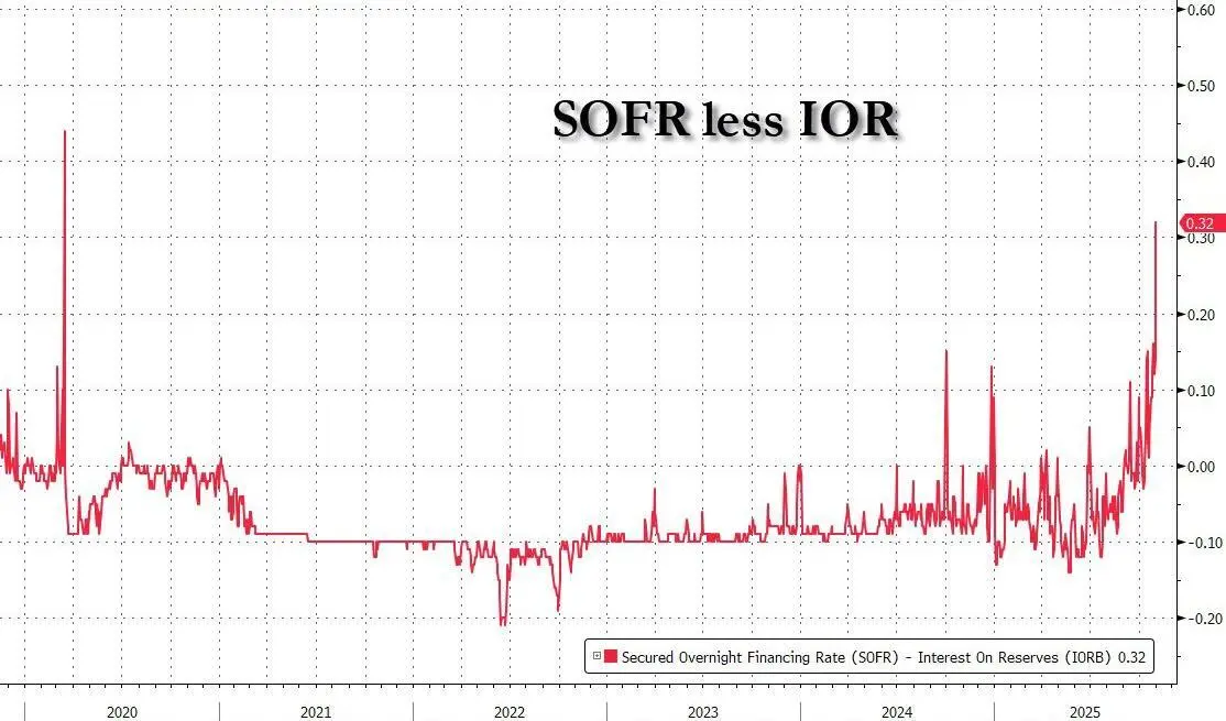 不仅SOFR利差扩大:三方一般担保利率(TGCR)与隔夜IORB的利差也飙升至25个基点,达到疫情以来的最高水平。
