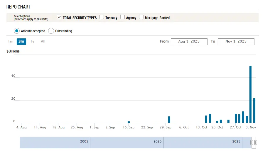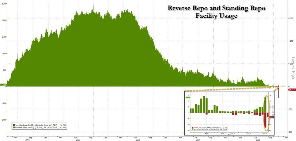 利率罕见暴涨!美国“钱荒”出现了? 尽管美联储已正式宣布将结束量化紧缩(QT),但从有担保隔夜融资利率(SOFR)和一般抵押品(GC)回购协议利率等回购市场指标,以及美联储常备回购便利(SRF)的使用情况来衡量,美国金融体系的资金状况在上周美联储决议后甚至仍在继续恶化…… 许多人曾预期流动性可能在月末后稳定下来,因为银行传统上会在那时进行账面粉饰并吸收流动性,但事实并非如此。 相反,部分市场人士此前关于“拖延至12月才终止缩表可能是鲍威尔和美联储最新政策失误”的观察似乎正在得到印证。在上周的议息会议中,美联储虽如市场预期宣布将结束量化紧缩,但时间窗口并非一些人猜测的那样从11月1日开始,而是决定等待整整一个月直到12月1日。 问题在于:上周五美联储主要流动性支持工具——常备回购便利工具(SRF)的使用规模已创下了503.5亿美元的纪录,主要受月末因素驱动(部分机构会缩减放贷及相关业务)。按理说,本周一SRF需求应出现下滑——实际上确实下滑了,但降幅远低于回购市场正常化应有的水平。 如下图所示,周一美联储通过常设回购工具再度向符合条件的金融机构共计放贷220亿美元,虽低于上周五异常峰值,仍创常备回购机制永久化以来的第二高纪录。该工具于2021年推出,旨在通过国债或抵押贷款债券作为抵押品提供快速贷款。