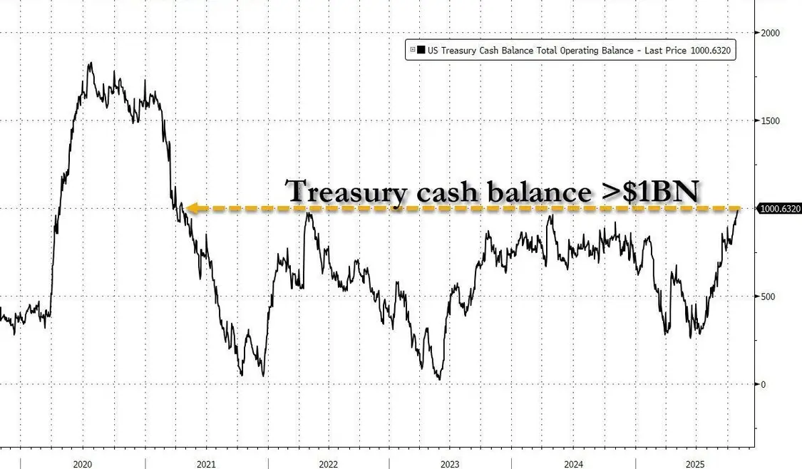 虽然上述惊人的数字都是上周五(10月底)创造的,但周一的数据显示,利率和利差几乎没有企稳的迹象——仍然波动不定,哪怕市场参与者曾预期,随着季节性因素的消失,融资成本将会恢复正常。 对此,有业内人士表示,虽然人们之前已讨论过造成当前资金紧张状况的诸多关键因素,但也许最重要的因素仍值得重申——即只要美联储政府不结束停摆,情况就会继续恶化。 需要注意的是,市场融资的最大用途之一就是美国财政部本身,特别是财政部一般账户(TGA)。截至上周五收盘,美国财政部的现金储备刚刚突破1万亿美元大关,创下近5年来的新高,也是自2021年4月以来的最高水平。