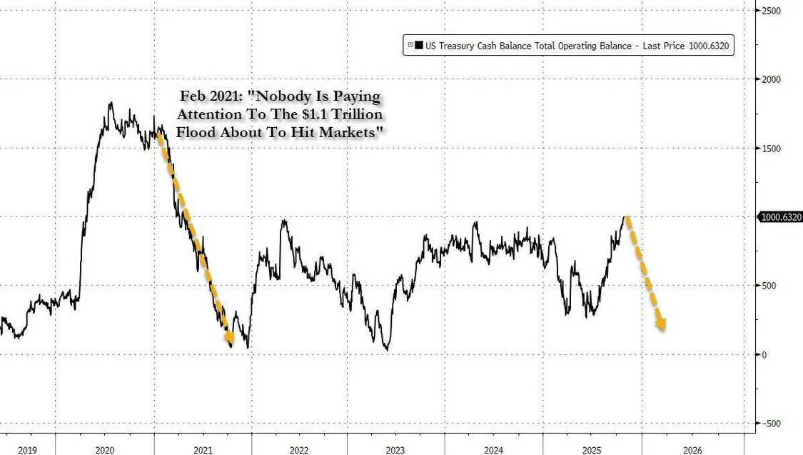 结论 总结来看,在流动性方面,人们目前可以得出几点观察推论: 美国资金状况很严峻,并且可能就此进一步迅速恶化,因为美联储本周仍正在进行的QT仍可能继续从已处于边缘的系统抽走流动性。而且由于市场资金具有残酷的反身性——如果回购市场紧张的每日指标(SOFR、一般抵押品利率、常备回购便利使用量)进一步恶化,市场可能进一步退缩,抽走更多流动性,从而形成“有毒”的负面循环,类似于2019年9月回购危机和2020年3月基差交易崩盘期间观察到的情况。 上述推论是坏消息。但好消息是,如上所示,资金流失的主要原因在于美国财政部本身,这其实也正引发着一些颇具讽刺性的探讨:贝森特如今是否其实已实质掌控美联储——其财政政策(尤其政府停摆期间)正主导着货币政策走向? 事实上,坊间就有一种说法是,如果美国财政部的TGA账户没有在过去3个月从3000亿美元飙升至1万亿美元,美联储本无需如此早的结束QT。 这当然也将人们引向一个结论:由于政府停摆起到了实际上的“加息”作用,从市场抽走了超过7000亿美元的流动性,当前现状(政府停摆)的逆转,可能也将导致新的资金涌入市场,因为财政部将不再受特殊的政府停摆会计规则约束,并将从美联储的财政账户向更广泛的经济释放数千亿现金。 确实,华尔街交易员们在2021年曾经历过几乎完全相同的场景,一旦政府重新开放,财政部现金余额的加速消耗——类似“隐性QE”——可能引发对风险资产的大规模抢购,由于正好赶在年底,推动了当时股市的大幅走高。