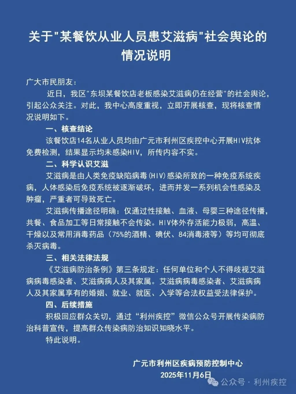 11月6日,四川省广元市利州区疾病预防控制中心通报: 近日,我区"东坝某餐饮店老板感染艾滋病仍在经营"的社会舆论引起公众关注。对此,我中心高度重视,立即开展核查,现将核查情况说明如下。 一、核查结论 该餐饮店14名从业人员均由广元市利州区疾控中心开展HIV抗体免费检测,结果显示均未感染HIV,所传内容不实。 二、科学认识艾滋 艾滋病是由人类免疫缺陷病毒 (HIV)感染所致的一种免疫系统疾病,人体感染后免疫系统被逐渐破坏,进而并发一系列机会性感染及肿瘤,严重者可导致死亡。 艾滋病传播途径明确:仅通过性接触、血液、母婴三种途径传播共餐、食品加工等日常接触不会传染。HIV体外存活能力极弱,高温、干燥以及常用消毒药品(75%的酒精、碘伏、84消毒液等)等均可彻底杀灭病毒。 三、相关法律法规 《艾滋病防治条例》第三条规定:任何单位和个人不得歧视艾滋病病毒感染者、艾滋病病人及其家属。艾滋病病毒感染者、艾滋病病人及其家属享有的婚姻、就业、就医、入学等合法权益受法律保护。 四、后续措施 积极回应群众关切,通过“利州疾控”微信公众号开展传染病防治科普宣传,提高群众传染病防治知识知晓水平。