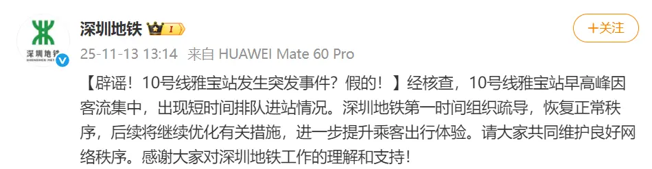 11月13日,深圳地铁回应此事,辟谣称:经核查,10号线雅宝站早高峰因客流集中,出现短时间排队进站情况。