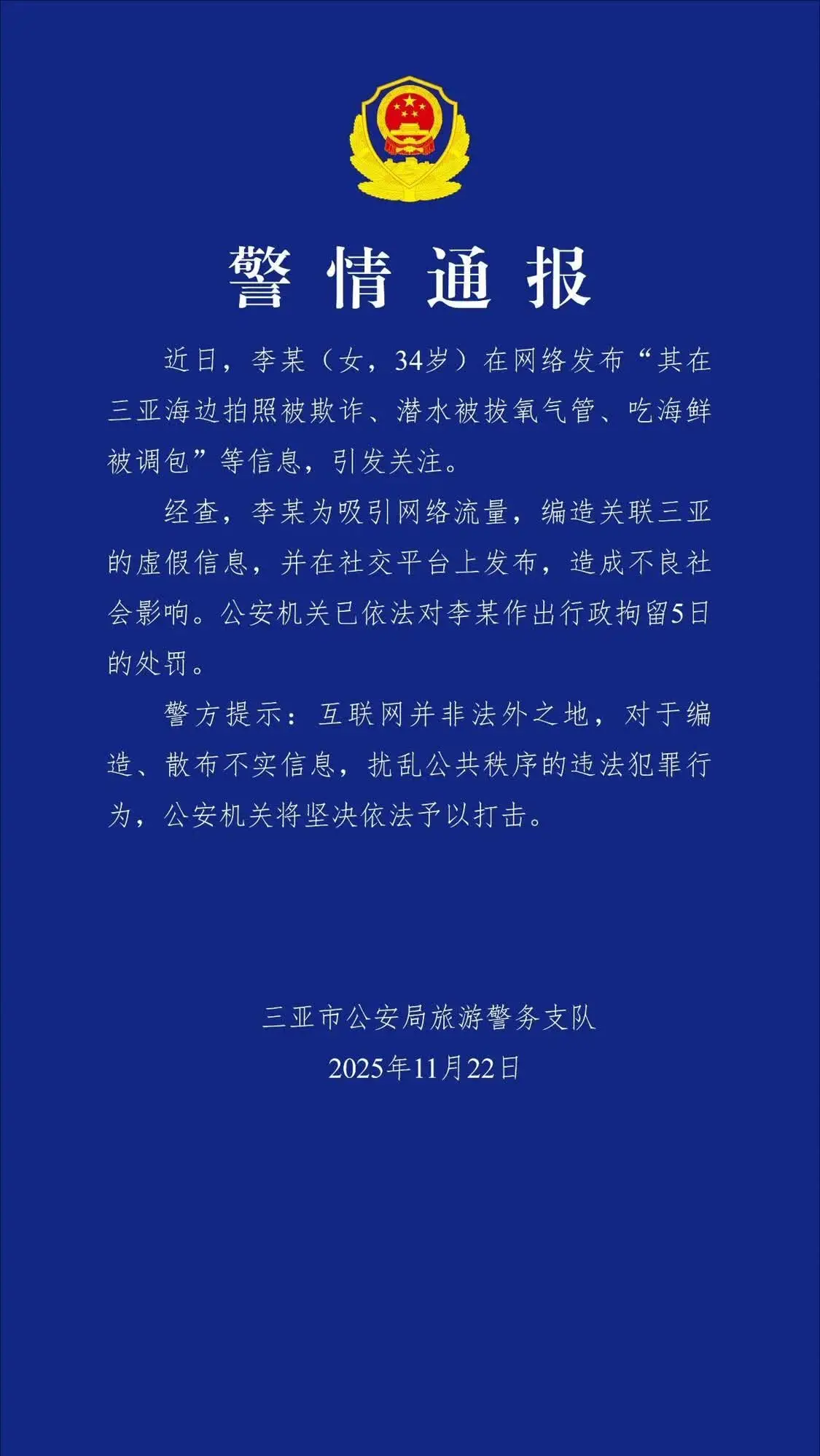 11月22日,三亚市公安局旅游警务支队发布警情通报:近日,李某(女,34岁)在网络发布“其在三亚海边拍照被欺诈、潜水被拔氧气管、吃海鲜被调包”等信息,引发关注。