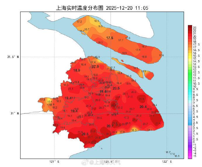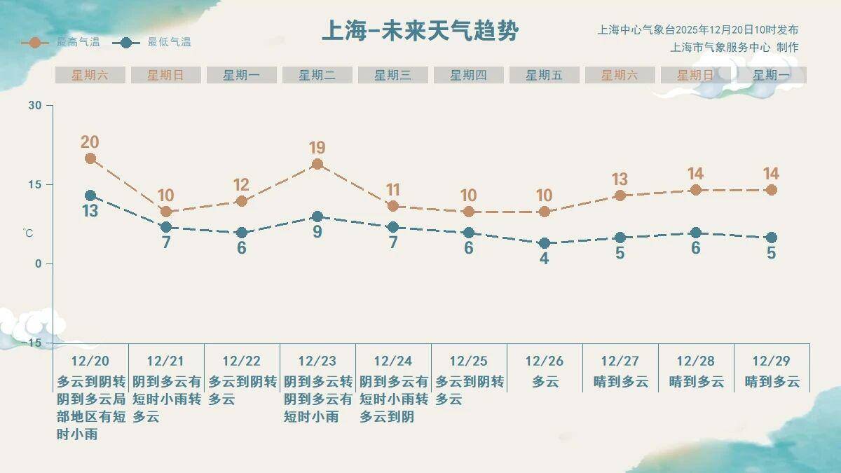 东方网记者柏可林12月20日报道:本周末,上海气温大起大落。北方有一股较强冷空气正在南下,今天申城云系有所增多,冷空气到之前,暖湿感依然明显,预计今天最高气温可达20℃上下。