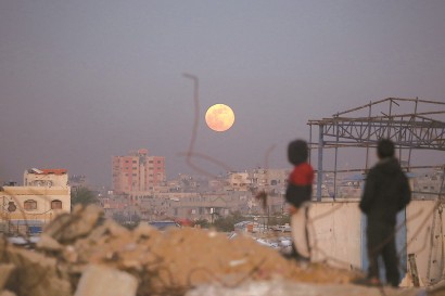 1月3日,在加沙地带中部,流离失所的巴勒斯坦儿童望向月亮。新华社发