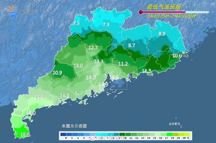 11日,韶关、清远、珠三角西部市县多云到阴天,有分散小雨和(轻)雾,粤东市县多云到晴,其余市县多云。最低气温:粤北市县10℃~12℃,粤西市县16℃~20℃,其余市县13℃~16℃。
