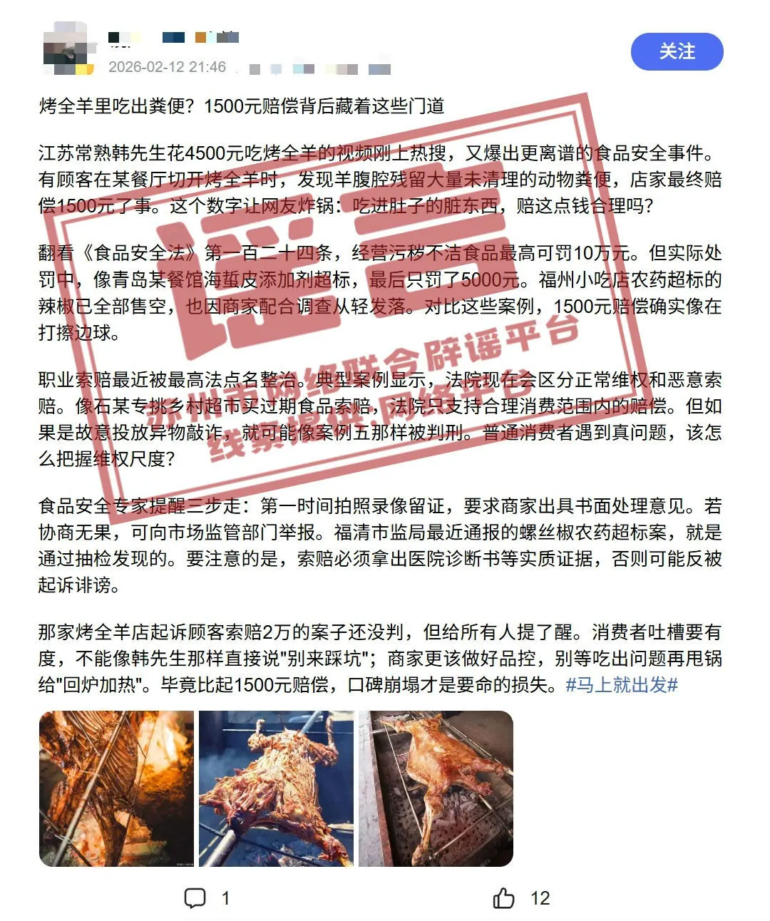近日,网上传播“江苏常熟一消费者在某餐厅食用烤全羊时发现,羊腹腔残留大量未清理的动物粪便,店家最终赔偿1500元了事”相关帖文,并在该帖文里标明发生地为江苏常熟。