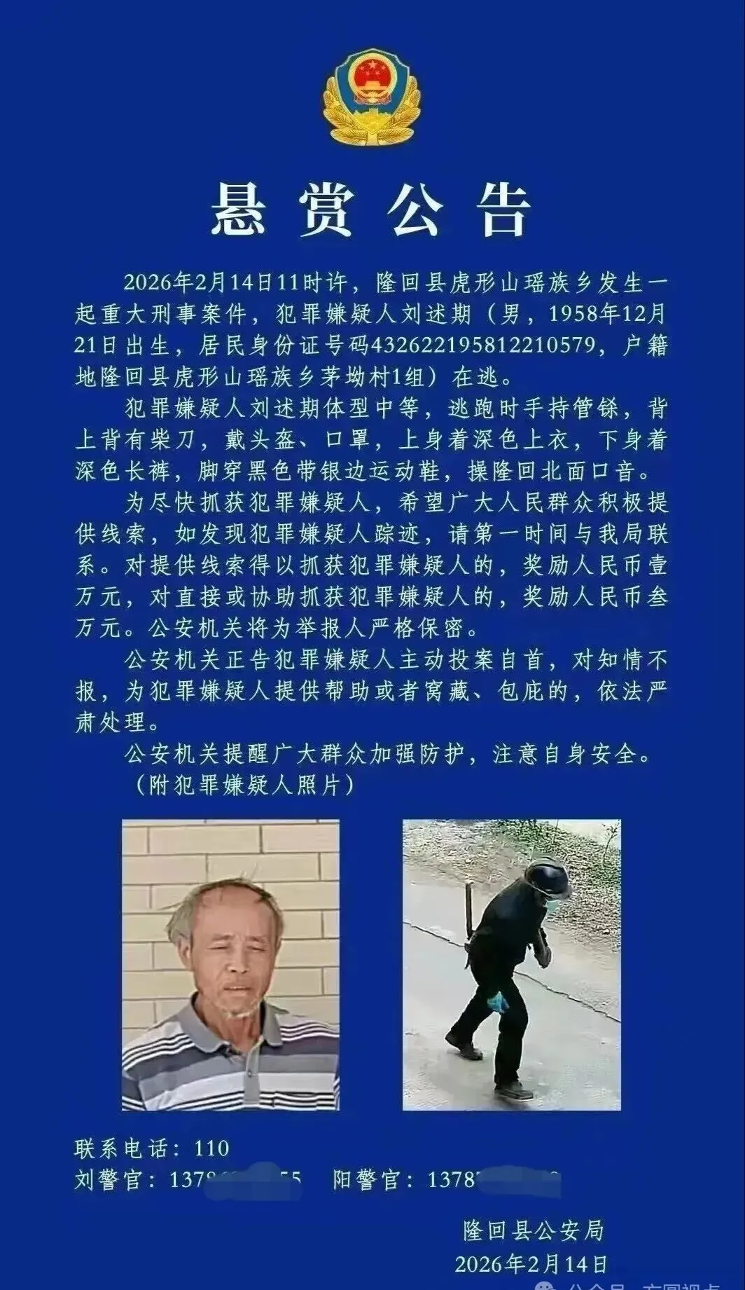 2月14日,隆回县公安局发布了一则悬赏公告:2月14日11时许,隆回县虎形山瑶族乡发生一起重大刑事案件,犯罪嫌疑人刘述期(男,1958年12月21日出生,户籍地虎形山瑶族乡茅坳村1组)在逃。刘某期逃跑时手持管铩,背上背有柴刀,戴头盔、口罩。警方希望人民群众积极提供线索,对提供线索得以抓获犯罪嫌疑人的,奖励1万元;对直接或协助抓获犯罪嫌疑人的,奖励3万元。