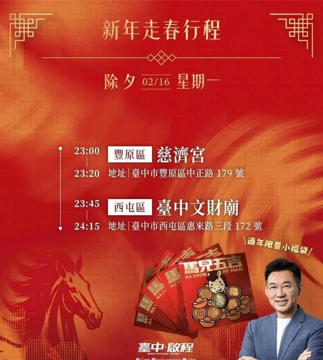 江启臣除夕夜将前往丰原慈济宫、西屯台中文财庙发送小福袋,活动持续至初四,21区的拜年行程长达5天。其中,初二与民意机构负责人韩国瑜在丰原慈济宫一起拜年;初一则在大里七将军庙、西屯永安区与市长卢秀燕合体发送小红包。