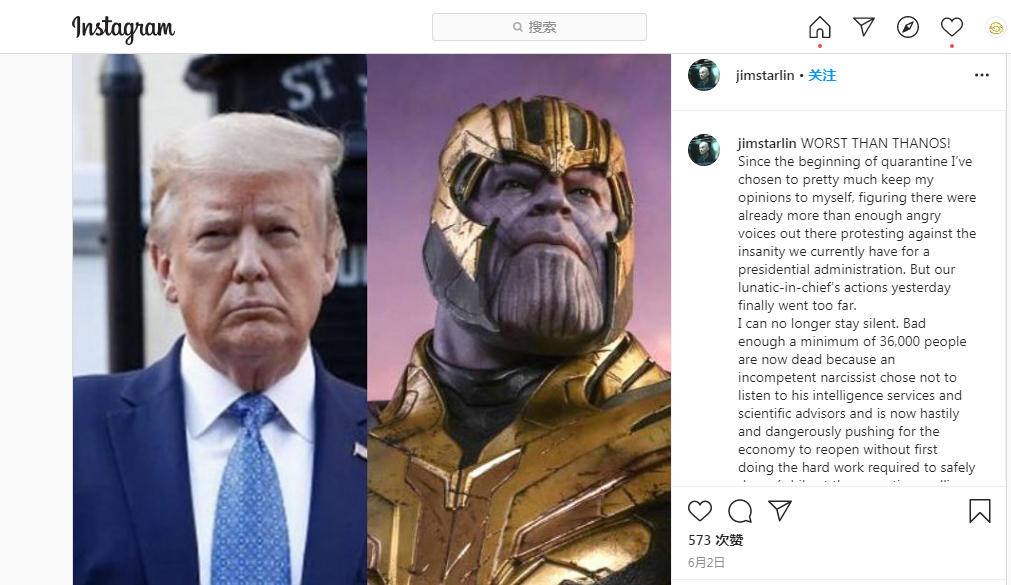 据英国《独立报》12日报道,吉姆·斯塔林这篇发布于6月2日的ins长文的开头第一句话就是“比灭霸还糟糕!”,而且还特意全部用了大写字体。斯塔林称特朗普是“不称职的自恋者”,至少36000人因他而死,“(特朗普)不听从他的情报部门和科学顾问(的建议),现在匆忙并且危险地推动经济开放。”