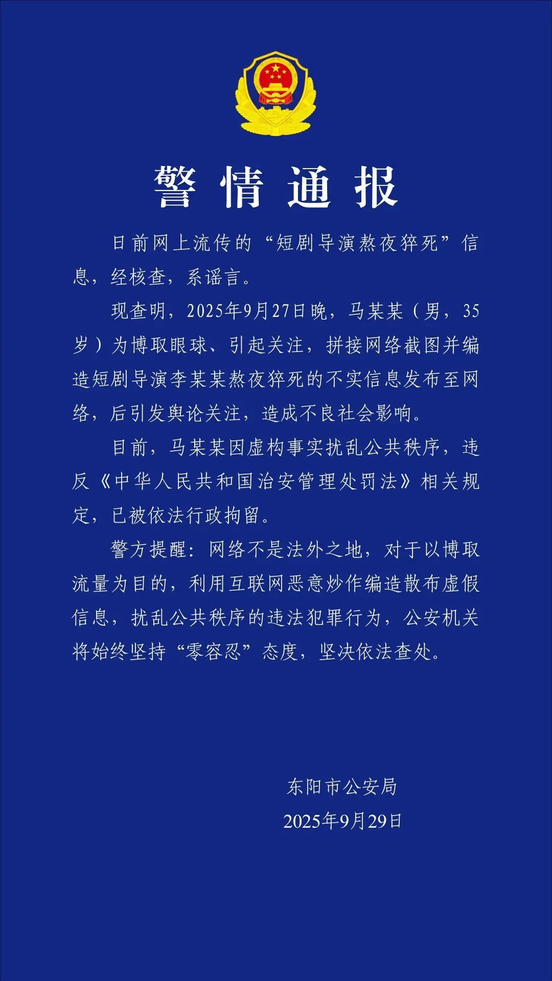 短剧导演李某某熬夜猝死?警方:他就在我们所里,来报案了