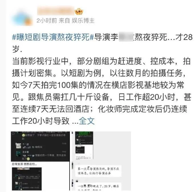 9月28日,有网友在社交平台发贴称,一名28岁的短剧导演李某某在浙江横店熬夜猝死,引发关注。随后,“曝短剧导演熬夜猝死”的话题冲上热搜。