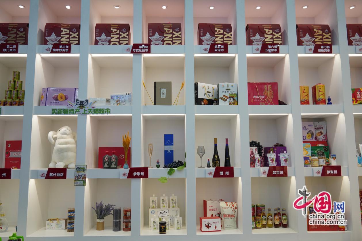 ▲“军垦之星”数创基地展示的全疆各地优质农产品。中国网记者 胡俊 摄