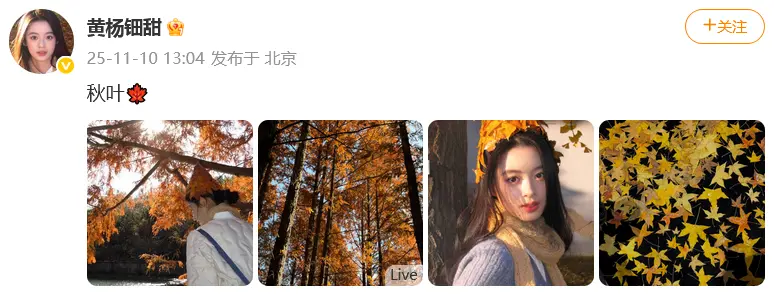 据现代快报消息,11月10日,女星黄杨钿甜更新了社交动态,发了一组秋日写真。这是她在耳环事件风波后首次更新动态,距离上次更新已经过去了半年之久。