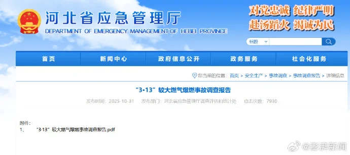 河北省应急管理厅官网发布“3·13”较大燃气爆燃事故调查报告。2024年3月13日3时15分许,地铁燕郊站至神威大街站区间盾构施工过程中,造成地埋天然气管道破损泄漏,天然气扩散至周边小张各庄综合服务楼C栋内,于7时54分许发生爆燃,事故造成7人死亡、27人受伤。经调查认定,这是一起生产安全责任事故。