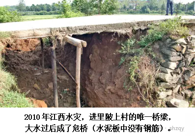 一天早饭过后,我看见一辆从抚州到吉安的绿色班车停在了公路桥上,车前方桥下的公路上,是很深的积水。有两个乘客脱了衣服顶在头上,光着屁股往桥下的积水里走(这时村里两个在路边看热闹的女孩红着脸逃回村里去)。乘客发现积水还是太深,汽车过不了,便慢慢地退回来,爬上了班车。班车费劲地掉了头,呜呜地往来路开回去了。