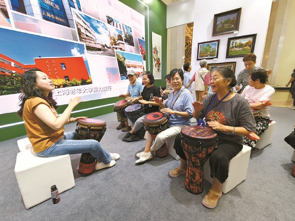 展会现场,老年人体验非洲鼓课程 本报记者 刘歆 摄