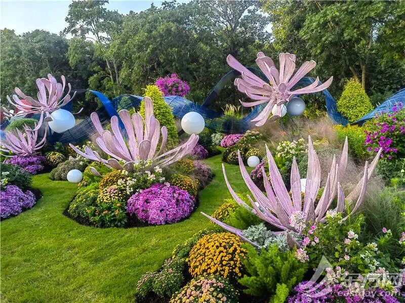 整座公园都布置了菊花花坛、菊花自然花境等景观,在西门主干道树坛及两侧,公园以精灵森林为主题,在原有花境基础上增加各类菊花材料的种植,融入松鼠、奇幻蘑菇、精灵贝壳等元素,打造独具一格的景观装饰效果。南广场入口区域嵌入菊花与多彩花卉、造型植物,以竹艺屏风模拟山水形态,营造富有韵律的空间层次。公园还充分利用优美的水系环境,在河岸边布置以菊花材料为主的自然花境。