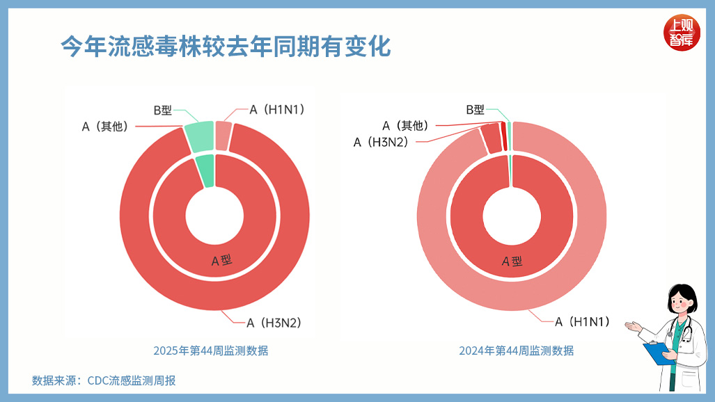 流感病毒分为A、B、C、D四个型别,其中A型是最主要的类型,也就是常说的甲流,常年占比在90%以上。甲流的亚型主要有H1N1和H3N2两种,去年报告的毒株主要是H1N1,而今年的监测数据显示,H3N2占整个甲流的98.2%。