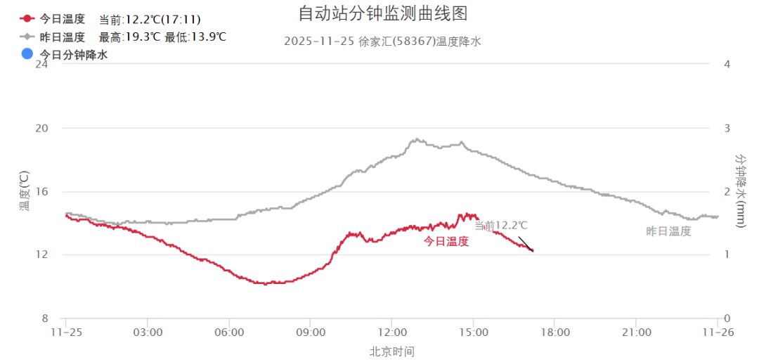 受冷空气影响 25日上海为晴到多云天气 风力增大 西北风4~5级阵风6级 沿江沿海地区5级阵风6~7级 气温回落 早晨全市大部气温起步 在8~11℃之间 白天天空状况理想 市区徐家汇站 最高气温升至14.6℃ 天气十分干燥 最低相对湿度在20%-30% 近期大家注意补水保湿的同时 需留意用火用电安全 明日天气 26日早晨叠加辐射降温影响 将出现此轮冷空气影响下最冷时段 预计上海中心城区最低气温5℃左右 郊区在0~3℃之间 局部地区有薄冰 白天延续晴天格局 稍有回暖 预计最高气温可达16℃ 昼夜温差超10℃ 着装上要注意了 中午以前偏北风3-4级 午后转为偏南风 相对湿度在60%-30%之间 依旧是天干物燥的深秋气息 天气趋势 周四又有冷空气造访 北风增大 白天最高气温止步13℃ 周五早间 中心城区最低气温又跌回5℃ 部分郊区重回冰点 双休日和下周初 晴或多云为主 天气相对温暖 下周三前后 将受新一股冷空气影响 出现大风和降温天气 未来十天气温起伏不定 请大家及时调整着装 谨防感冒 尽管冷空气一波接一波 但由于没有水汽相配合 未来一段时间上海没有明显雨水 加之入秋以来 降水也较常年同期明显偏少 11月至今,徐家汇站总降水量仅8.5毫米,不足常年11月平均降水量的两成。 天干物燥 气象火险等级居高不下 请务必注意用火安全 来源:东方网综合上海天气发布、@上海市天气 编辑:宋世平、小能手 审稿:卞英豪